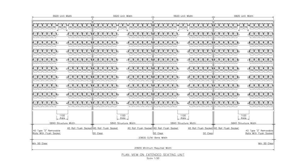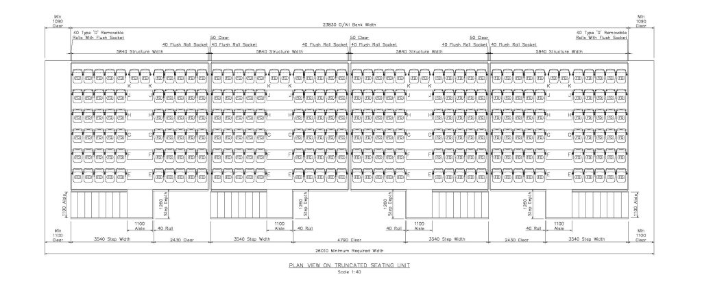 To add further flexibility, the seating units can also be opened fully, or opened in a “truncated” arrangement whereby the rear rows only are opened and step units are added in front (see images below).