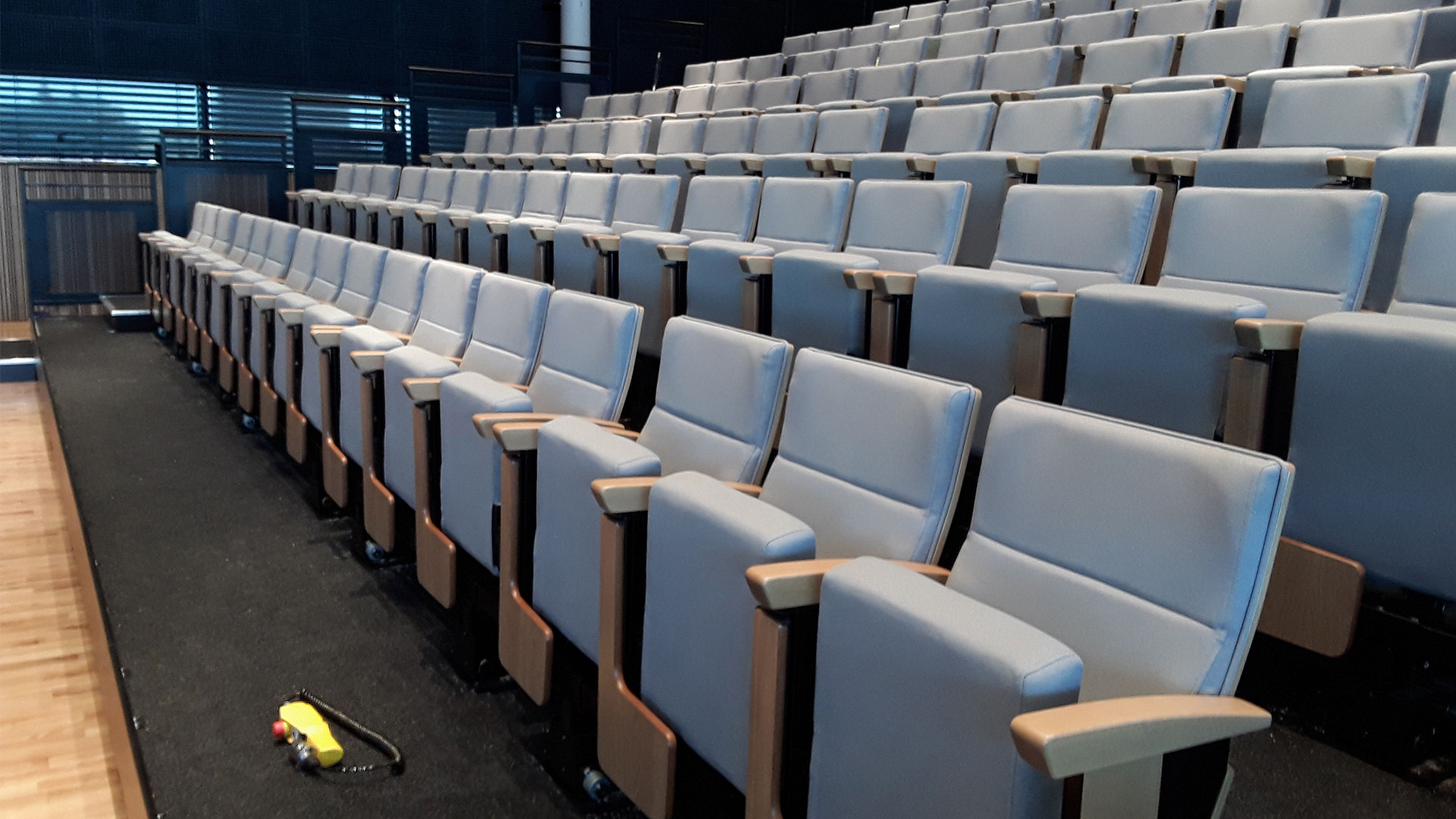 Once the chairs have been folded down in groups of 3 or 4, the power operated platforms can be closed away at the touch of a button, allowing the facilities team to quickly reconfigure the room.
