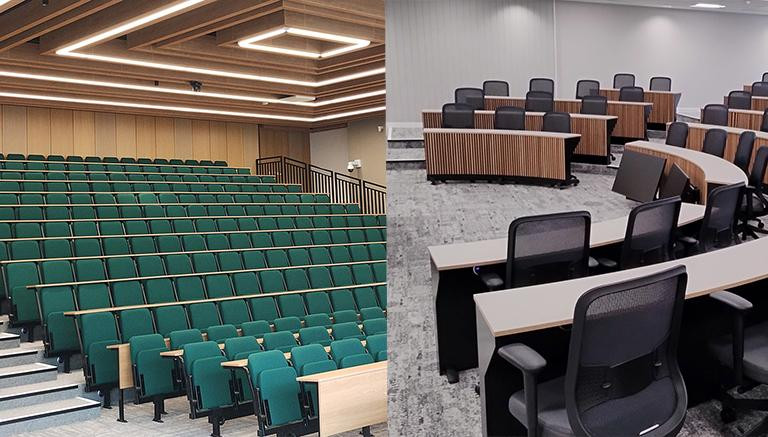 In the lecture theatre, the bank of seating blends beautifully with the walls and the striking ceiling – the tiers are finished with a smart side panel, and oak writing tablets. The seat backs are individually manufactured for each row – varying in height, they create a seamless appearance to the seating bank. Rollaway sections of writing desk towards the front of the room are designed to assist students with disabilities.