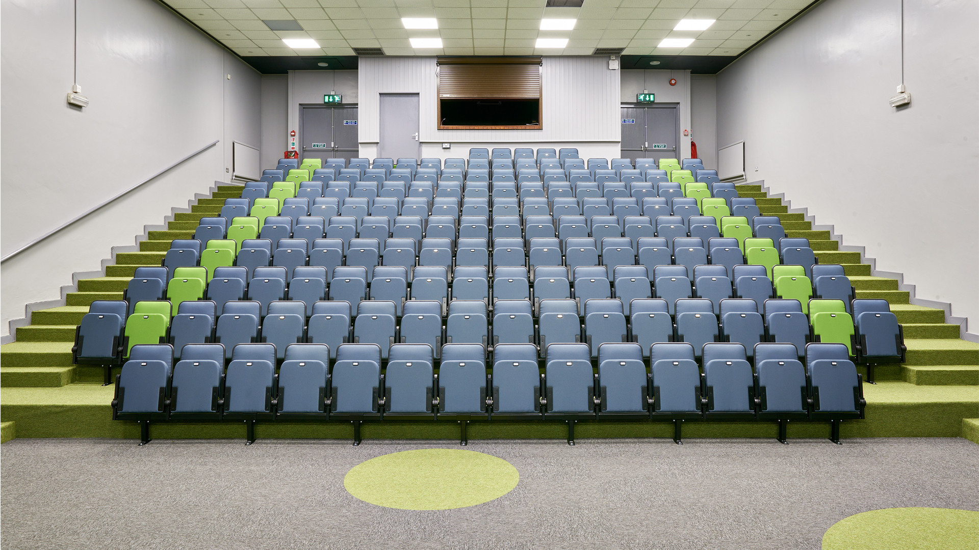 The seating replacement was carried out by our aftersales department, who also specialise in refurbishment projects – whether chairs need to be reupholstered or completely replaced. In this case, the fully upholstered seats were replaced with smart new Accolade chairs in a calm, contemporary colour scheme. The Accolade chairs feature wrap around plastic panels to the rear, which prolong the life of the upholstery. The college also freshened up carpets the theatre’s walls and carpets, and the finished result looks fantastic.