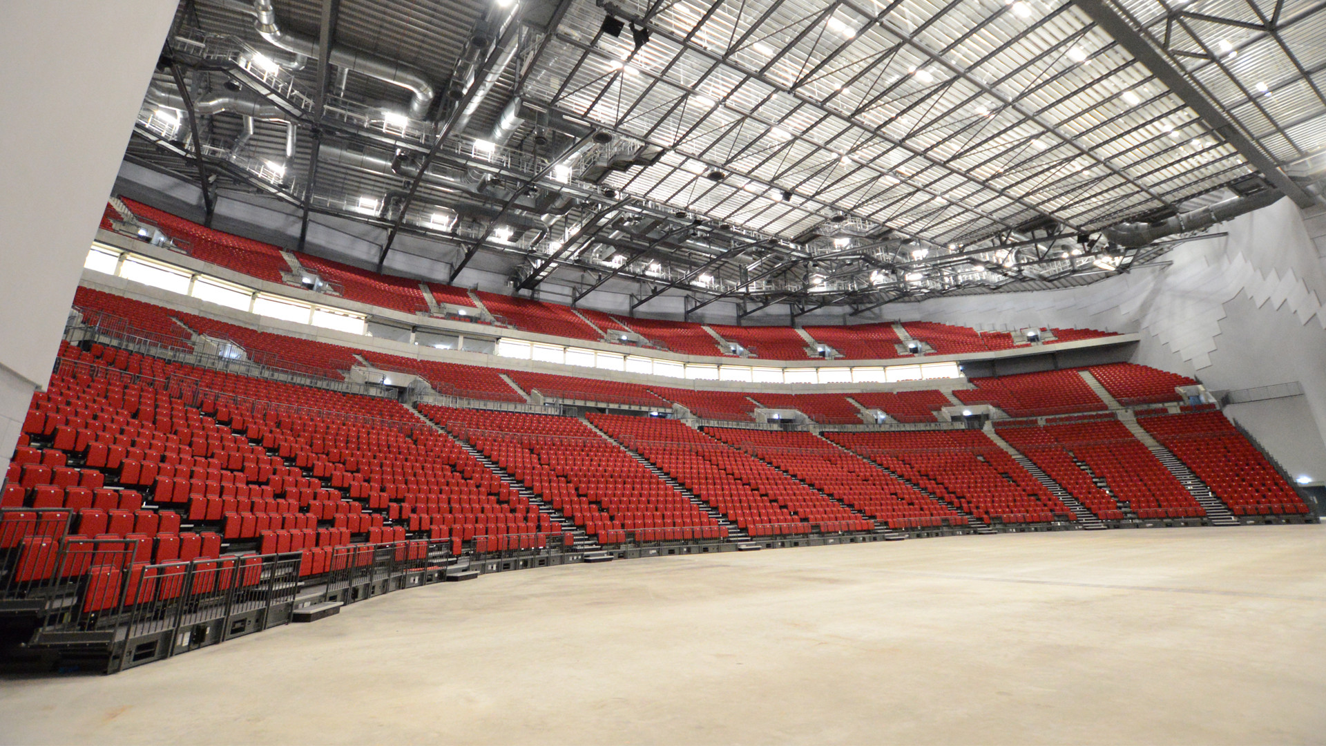 With cherry red upholstery, the towering rake of seating will certainly prove a daunting sight for the performers or sportsmen on the stage – and that’s before the 13,500 spectators crowd in.