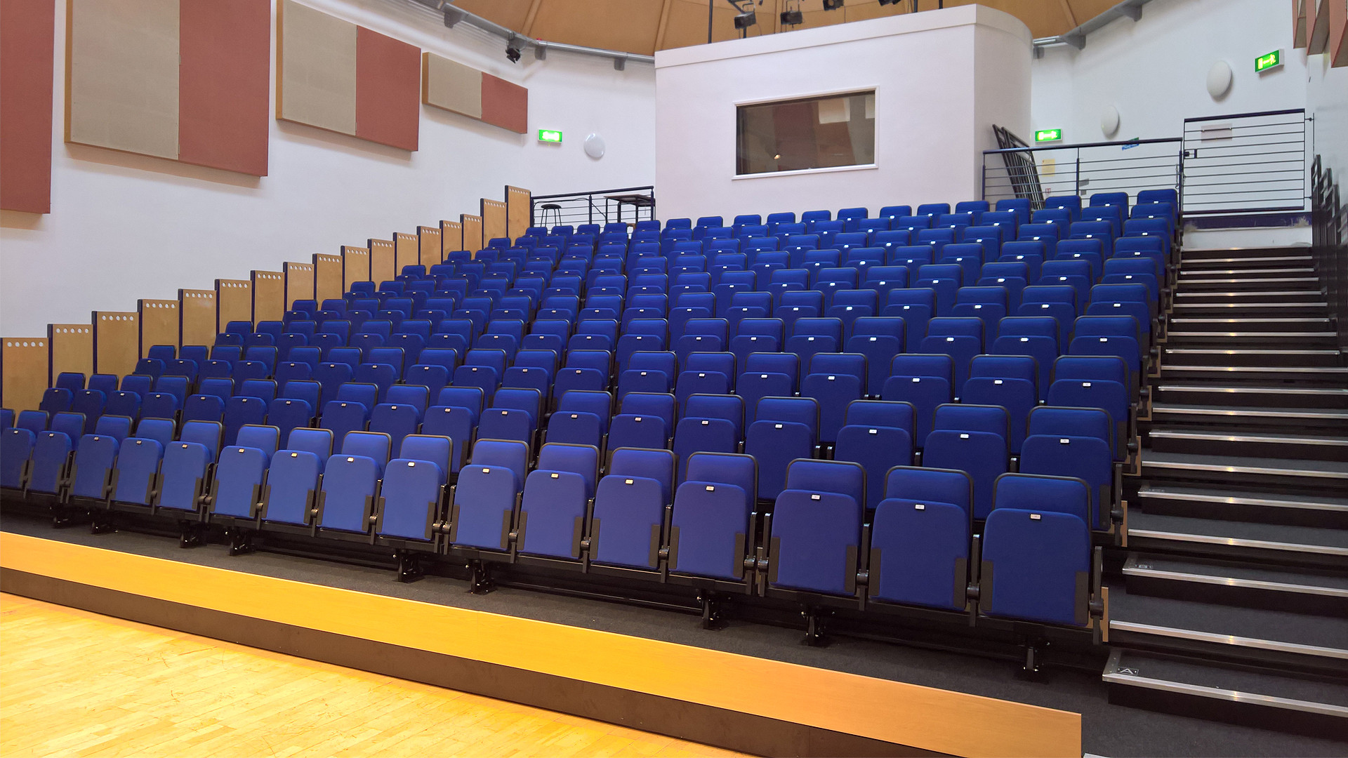 Audience Systems installed this smart, durable retractable seating system in the Maidment Building – Shrewsbury School’s beautiful music centre. As well as looking the part, the seating has several features that make it really practical and easy to use: