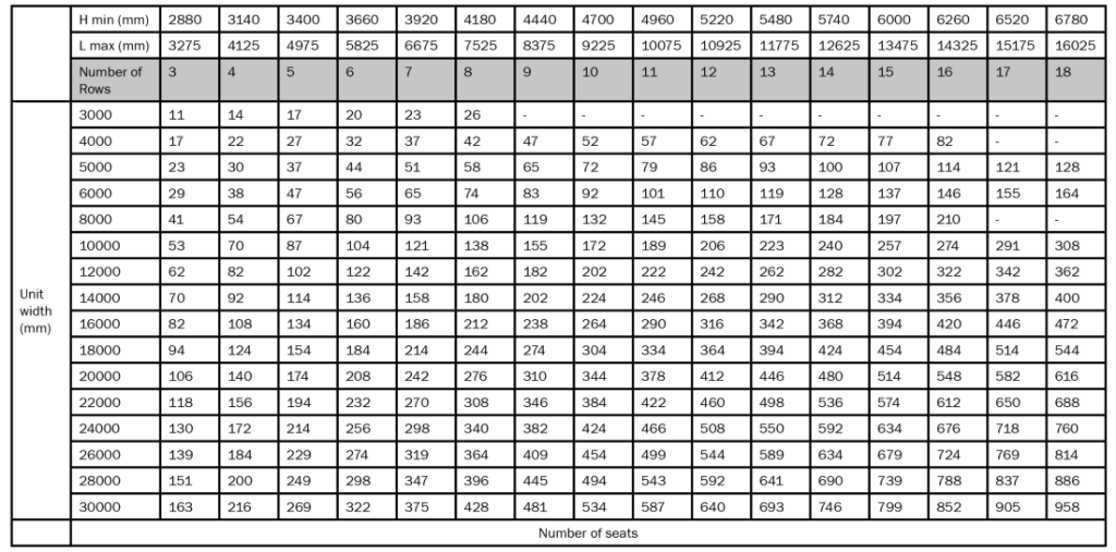 In order to create the below table, we made some assumptions about the specification of your retractable seating.