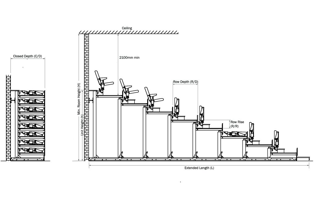 Unit Height (h) – The overall unit height is (Number of Rows)*(Row Rise) + 170mm. 170mm is the height of the small platform at the rear.
