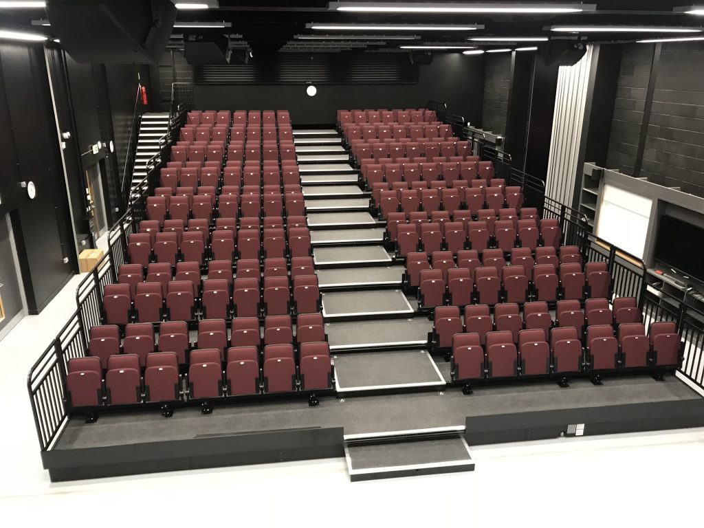 With a stage area at floor level, you might want to avoid stalls seating, but you still may be limited by ceiling height. In this case, we can specify a “double row depth” system – where each platform of the retractable system is two rows deep. And that also means that all your seating can be packed away in one go.