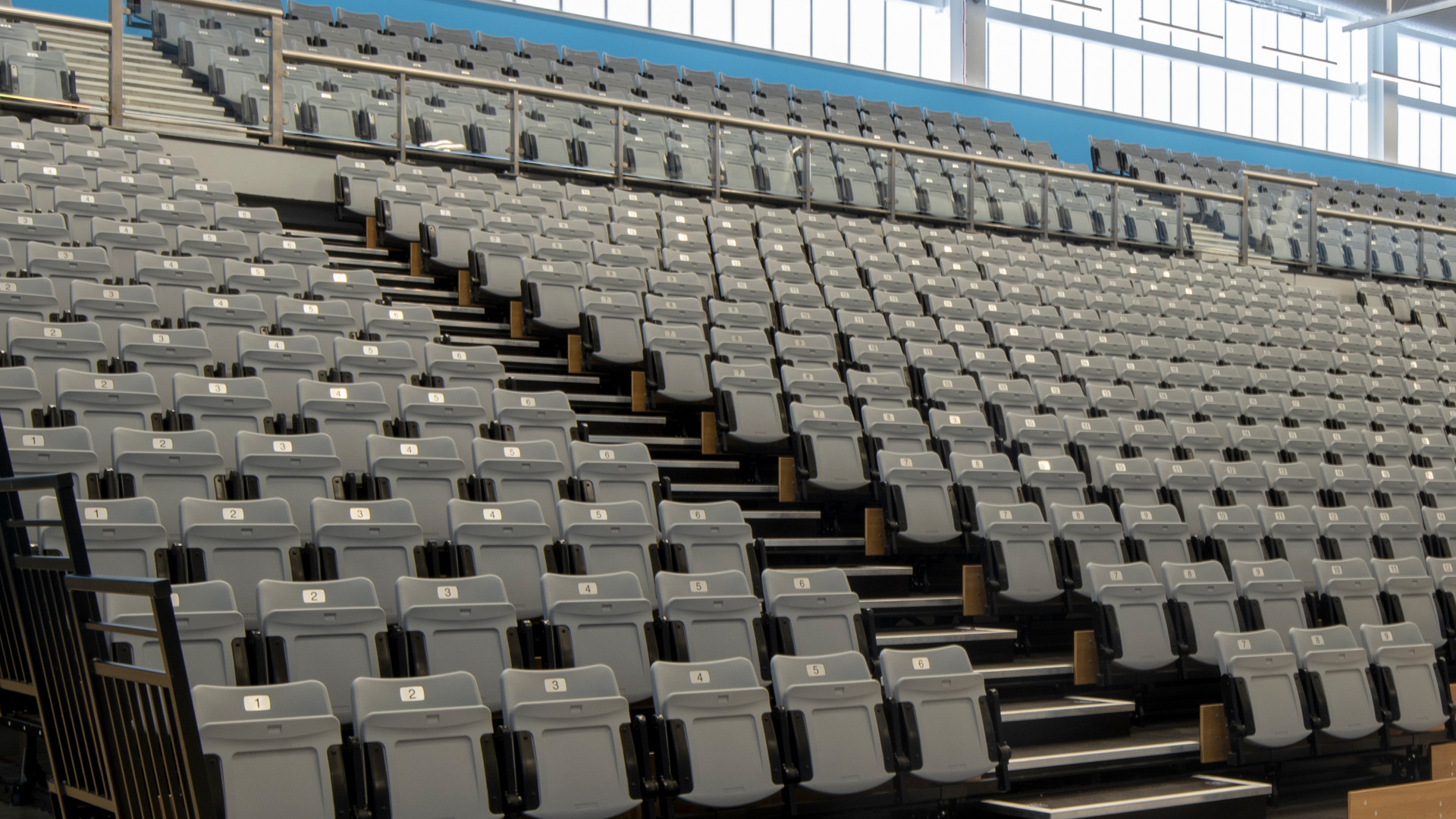 The chair has two possible positions for seat numbers. A large number can be housed on the front side of the backrest or a more discrete number can be placed on the seat pan. Row letters can also be located on the stanchions.