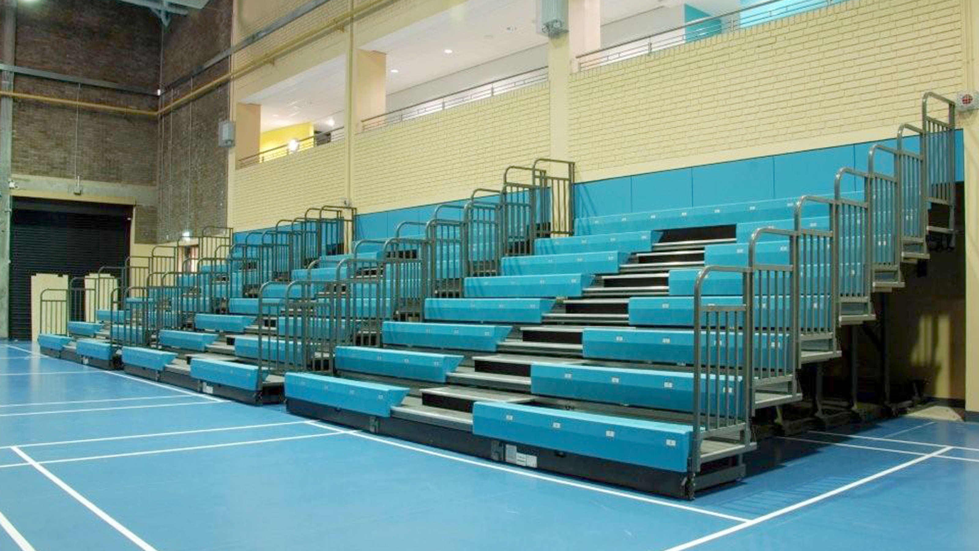 For new build sports halls, the seating can be designed to disappear into a recess in the wall, keeping the playing area clear and speeding operation time.